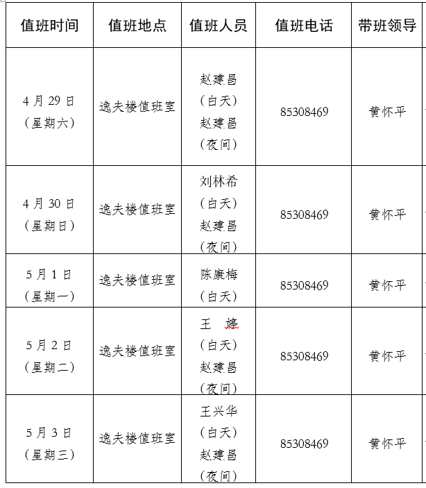 4.假期值班时间:上午:8:30—12:00 下午:14:30—17:30