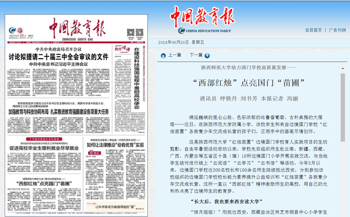 6月28日,《中国教育报》在头版刊登报道文章《陕西师范大学助力国门学校高质量发展——“西部红烛”点亮国门“苗圃”》。文章从“长大后,我也要来西安读大学”“我们要像石榴籽一样紧紧抱在一起”“‘量身定制’的国门学校校长培训”等三个生动侧面切入,以今年3月以来边境国门学校近300名校长和100余名师生来西安参加酷爱成人网