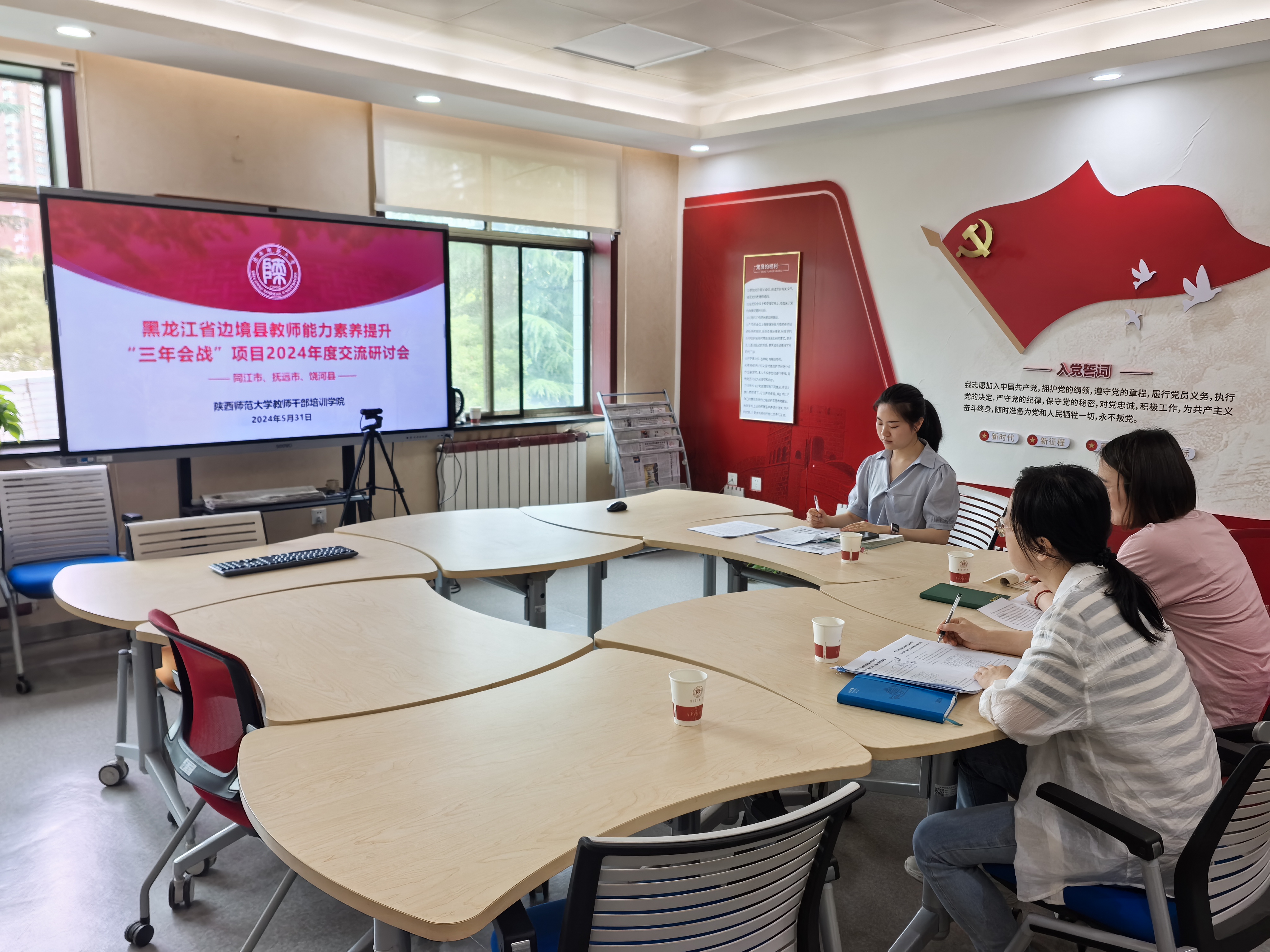 龙卓华介绍了2024年度黑龙江省教育厅关于本项目的指导意见、招标文件与实施方案等内容,指出本年度项目培训方式为集中培训与网络培训相结合。结合文件要求及前期对上述三个边境县的需求调研,2024年度将以“三名”工作室建设为主题来设置培训方案,初步制定出“7天西安集中研修+5天精准送教+3天延安红色研学”研修思路,并征集各县对今年项目的安排和意见。陈茜介绍了“三名”工作室建设的初步设想,表示将以各县基础教育样板校建设中的现实问题为牵动,精准为各县制定培训方案。